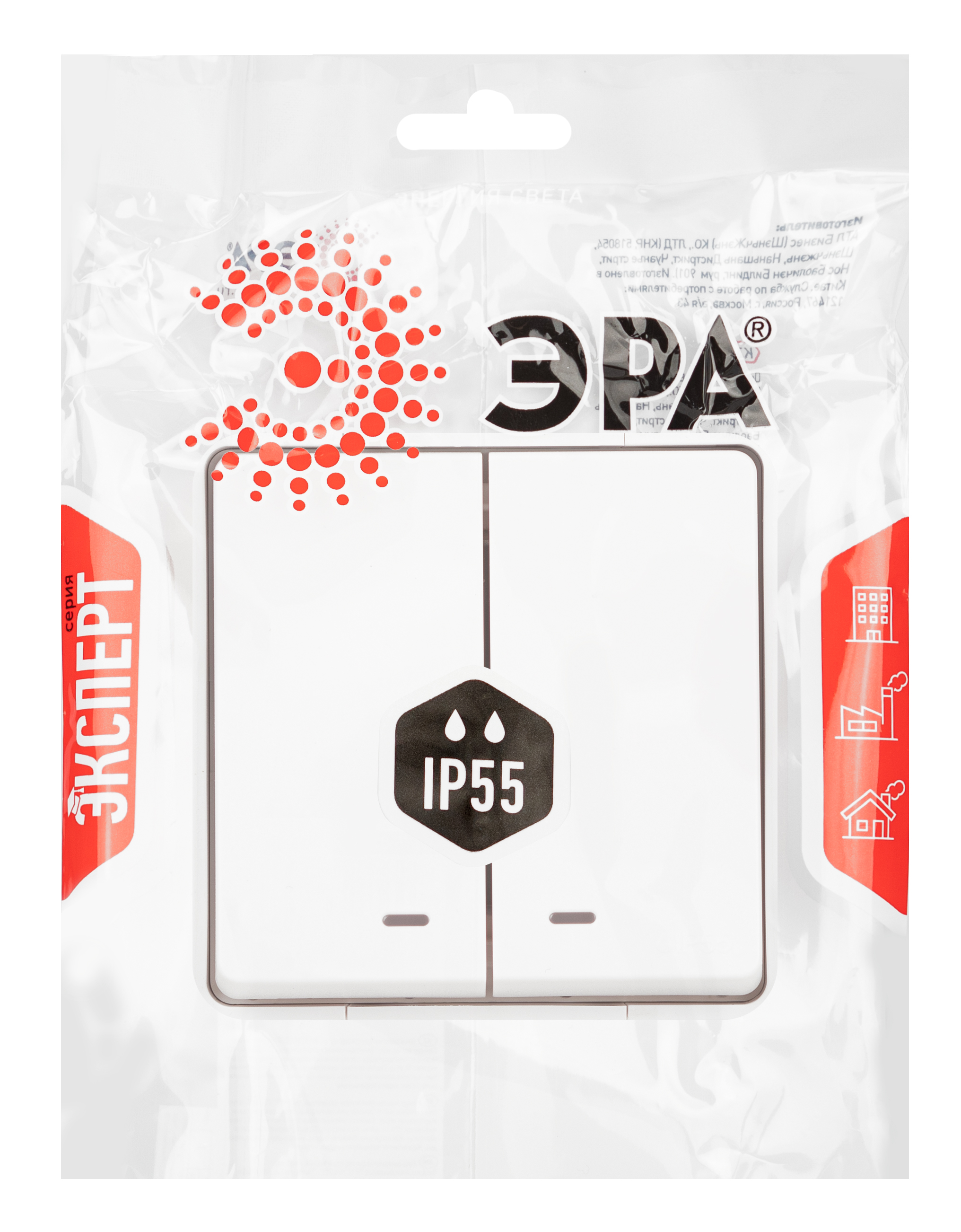 Выключатель влагозащищённый 2-клавишный с подсветкой серии Эра Эксперт накладн IP55 цвет белый 11-1505-01 открытой установки.. Номинальные характеристики 10А 250В. Выполнен из качественного поликарбоната, оснащён уникальными винтовыми клеммами ЭКСПЕРТ для максимально качественного зажима кабеля в механизме.