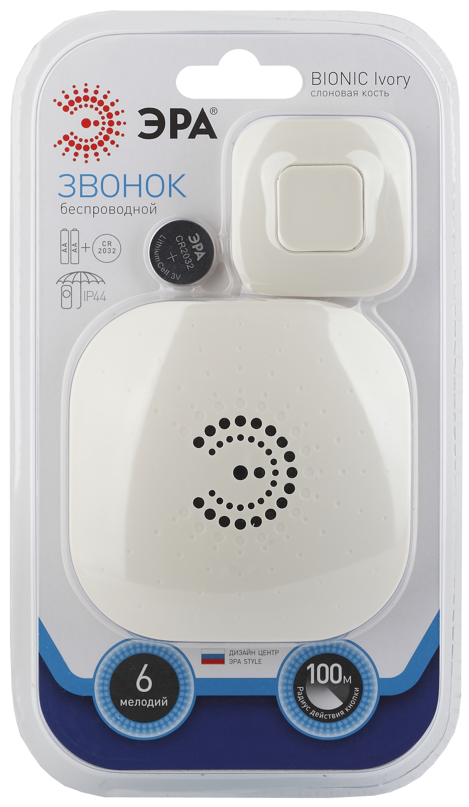 Этот стильный беспроводной звонок цвета слоновой кости разработан в России дизайн-центром ЭРА. Подходит для любых помещений - квартир, домов, загородных участков. К одной кнопке можно подключить много динамиков и наоборот - к одному динамику несколько кнопок. Их можно объединить и в общую сеть, если у вас несколько калиток и строений на одном участке: все кнопки подключаются ко всем динамикам. Радиус действия достигает 100 метров. Идеален для дачи - быстрая установка, кнопки защищены от влаги и пыли (IP44), динамик - IP 20. Звонок не зависит от наличия электроэнергии, он работает от батареек: динамик от 2 штук АА (в комплект не входят), кнопка - от СR2032 (в комплекте). Дополнительный бонус электрозвонка ЭРА BIONIC после его установки не нужно ломать голову, куда спрятать провода.