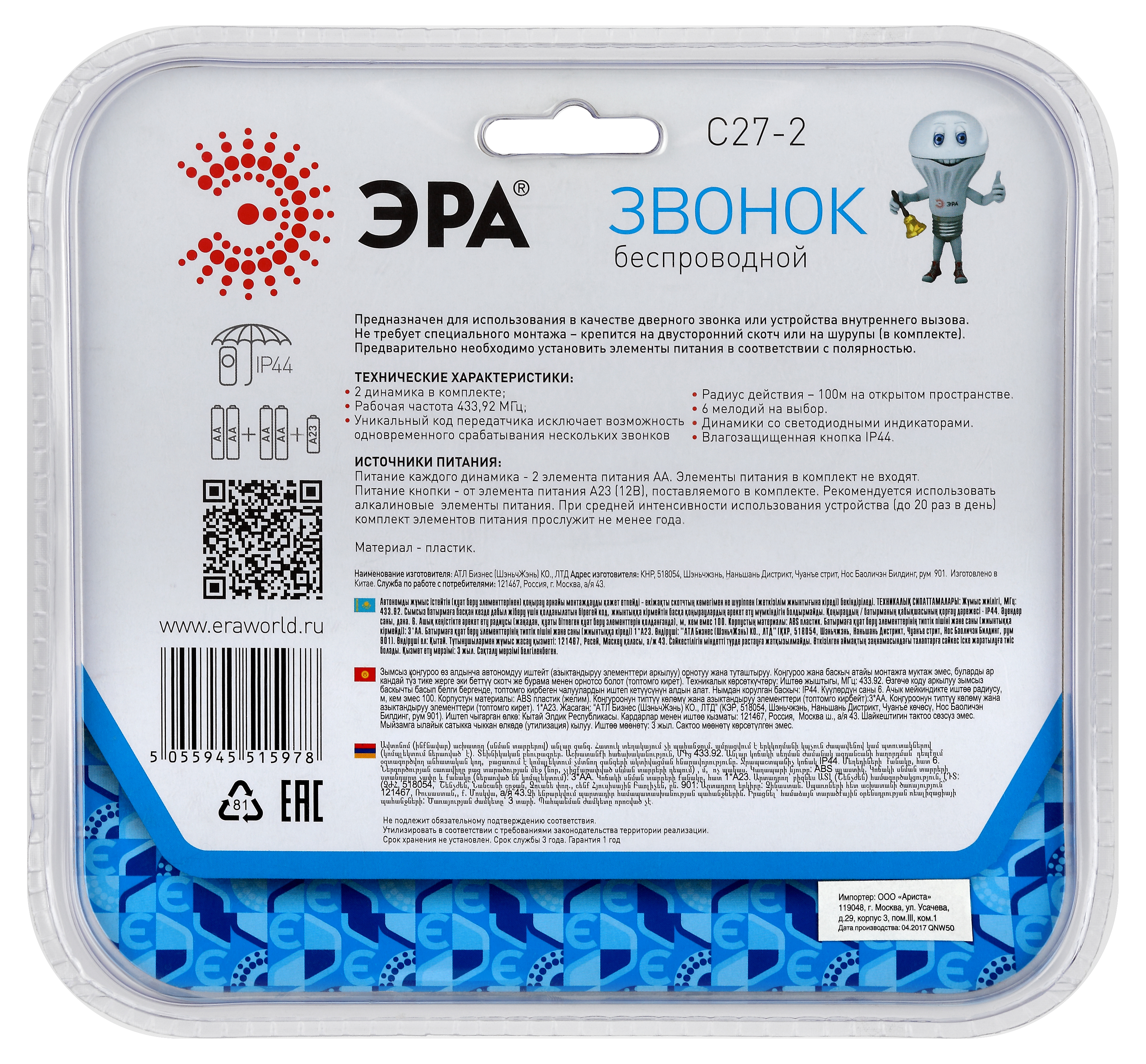 Беспроводной электрический дверной звонок с 2 динамиками в комплекте. Динамики можно с удобством разместить в разных комнатах или разных помещениях (актуально для дач и загородных домов с многочисленными постройками на территории). Радиус действия до 100 метров. Кнопка защищена от влаги и пыли (IP44). В числе преимуществ 6 встроенных мелодий и световой сигнал. Звонок работает от батареек: для кнопки - 1 шт А23 (входит в комплект), для каждого из динамиков - по 2 шт АА пальчиковые (в комплект не входят).