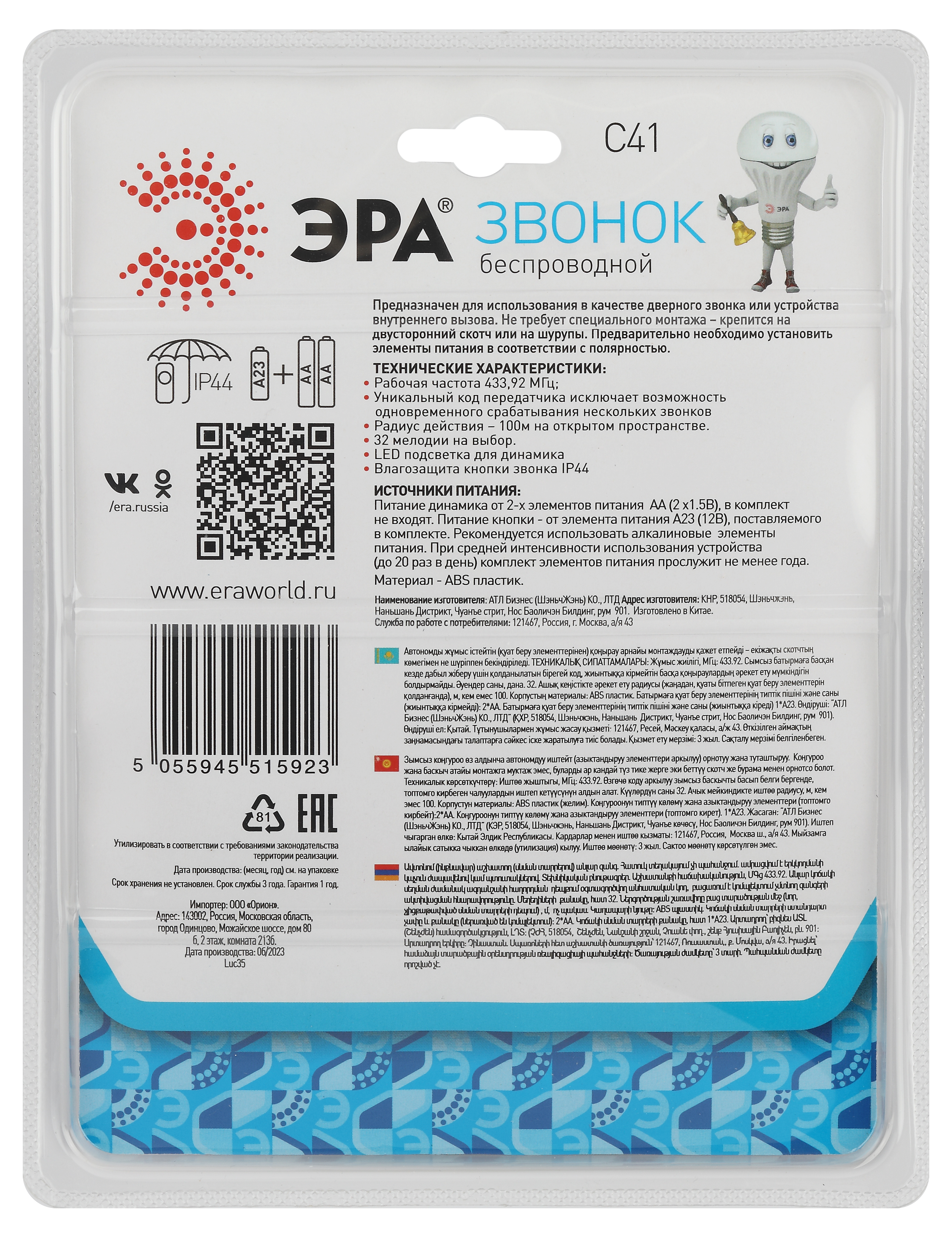 Беспроводной электрический дверной звонок с 32 мелодиями и влагозащищённой кнопкой, под которой предусмотрено пространство для указания номера квартиры. Прост в подключении. Отсутствие проводов позволяет использовать звонок с максимальным удобством. Динамик можно разместить в коридоре или взять с собой в комнату/на кухню если не хотите разбудить кого-то из домочадцев. Беспроводные звонки ЭРА хороши для дачи или загородного дома установите кнопку на дверной калитке, а динамик в помещении. Радиус действия - до 100 метров. Звонок работает от батареек: 1 шт А23 для кнопки (входит в комплект), 2 шт АА пальчиковые для динамика (в комплект не входят). При среднем использовании (до 20 звонков в день) исправно проработает без замены элементов питания не менее года.