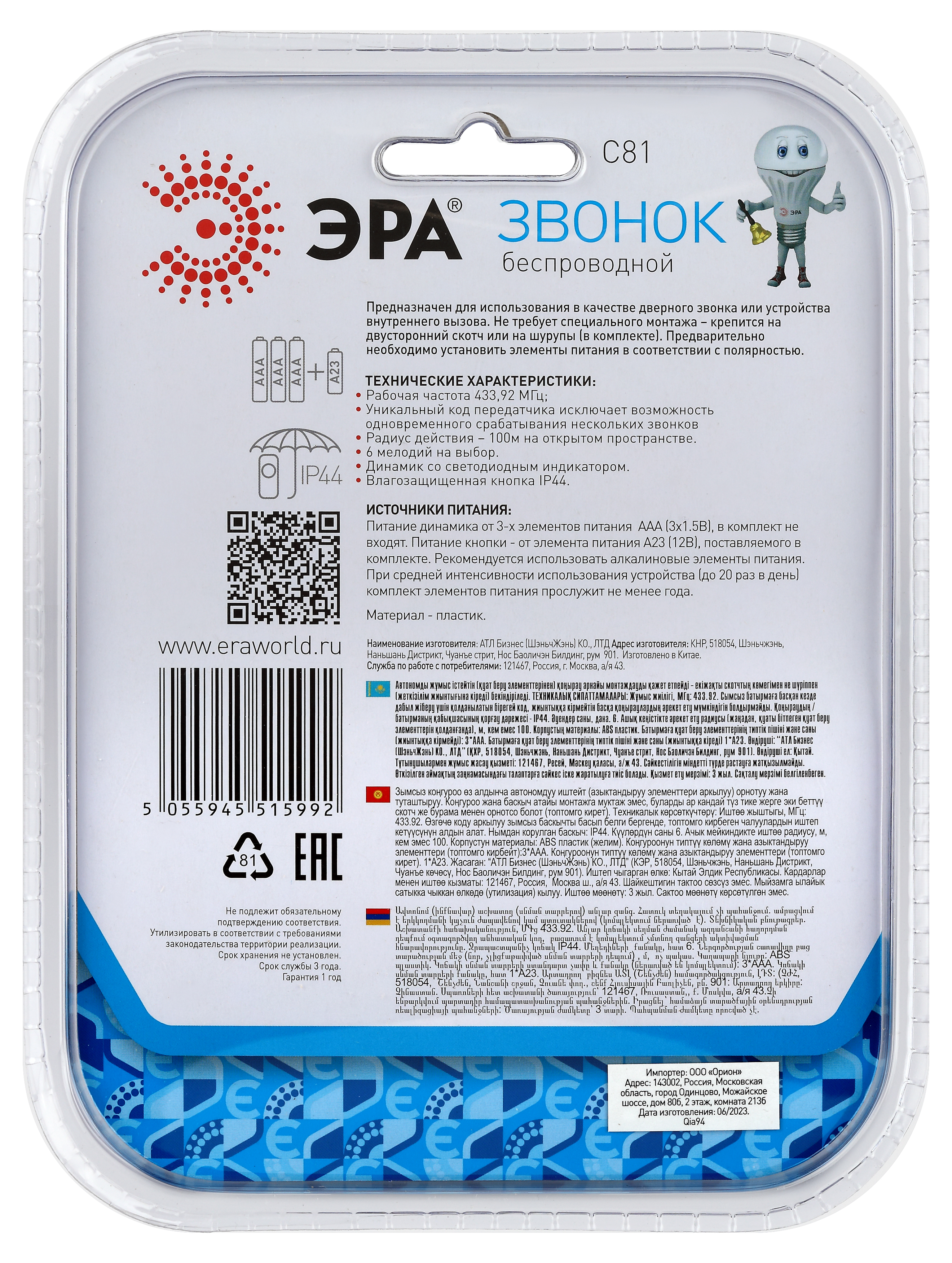 Беспроводной электрический дверной звонок с 6 качественными мелодиями, световым сигналом и влагозащищённой кнопкой. Прост в подключении. Отсутствие проводов позволяет использовать звонок с максимальным удобством. Динамик можно разместить в коридоре или взять с собой в комнату/на кухню если не хотите разбудить домочадцев. Беспроводные звонки ЭРА хороши для дачи или загородного дома установите кнопку на дверной калитке, а динамик в помещении. Радиус действия - до 100 метров. Звонок работает от батареек: 1 шт А23 для кнопки (входит в комплект), 2 шт АА пальчиковые для динамика (в комплект не входят). При среднем использовании (до 20 звонков в день) исправно проработает без замены элементов питания не менее года. Аккуратный внешний вид и приятная упаковка - отличный подарок на новоселье и другие праздники!